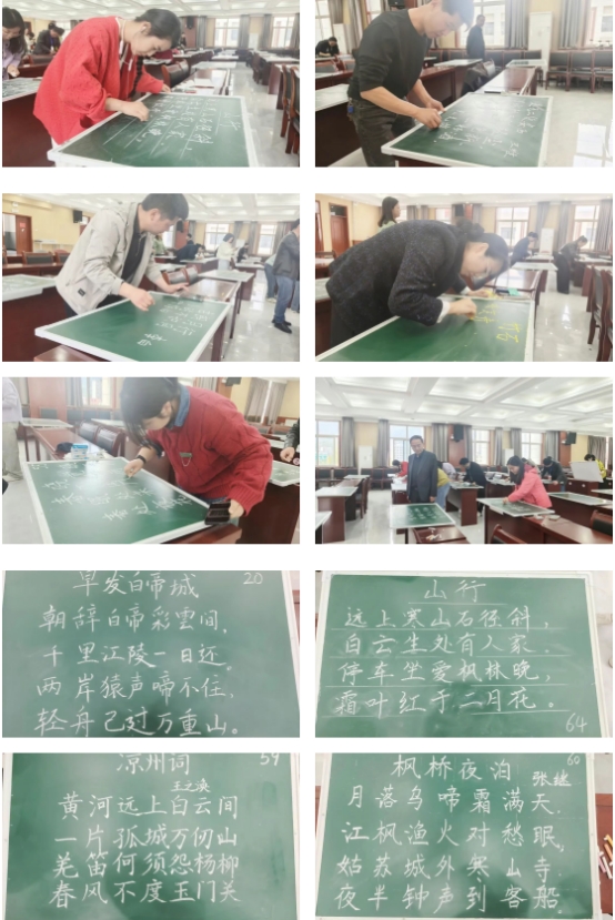 粉笔为笔,黑板为纸,教师们凝神静气、挥笔书写。一首首经典古诗在笔下工整呈现,笔画规范、结构匀称、行款整齐,充分展现了扎实的书写功底与严谨的教学态度。一笔一画见功底,一字一句显初心,实用、规范、美观的书写,既是教师的基本功,更是课堂教学的无声名片。