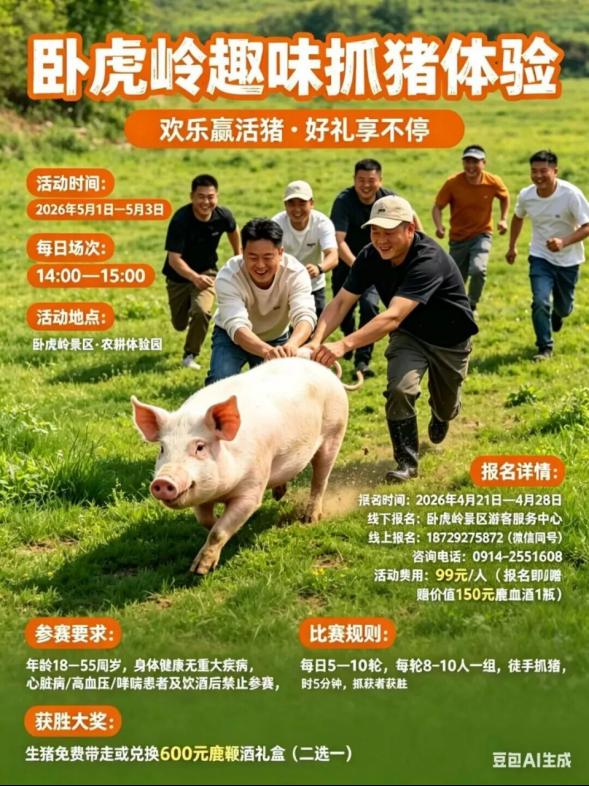 首届抓猪大赛:5月1日至3日每天13:00—15:00趣味开跑,与萌猪赛跑,快乐就是这么简单。