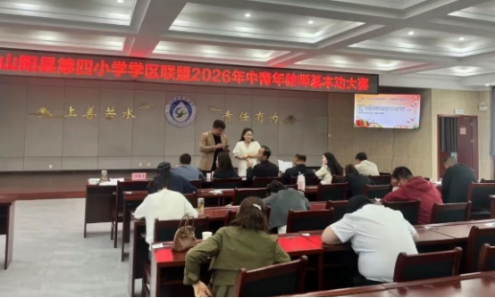 为深入落实立德树人根本任务,全面提升学区联盟中青年教师综合素养与班主任专业能力,2026年4月23日下午,商洛市山阳县第四小学学区联盟隆重举办“2026年中青年教师和班主任基本功大赛”。来自第四小学、第六小学、十里中心小学、高坝中心小学、天竺山九年制学校的39名优秀教师同台竞技,以扎实的基本功和深厚的教育情怀,呈现了一场精彩纷呈的专业盛宴。