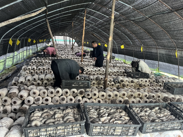当天的出菇情况,一边向笔者算起了经济账:“我们村这几年集中力量发展食用菌,目前种植规模稳定在220多万袋,像这样的标准化大棚有300多个。仅这一项产业,每年就能带动全村100多户群众参与务工和分红,村集体经济收入去年达到33.6万元。”他指着收获满满的大棚,言语间满是信心,“下一步,我们还要把菌棒生产、技术培训和市场对接做得更精细,让小小平菇真正成为全村人的‘致富菇’。”