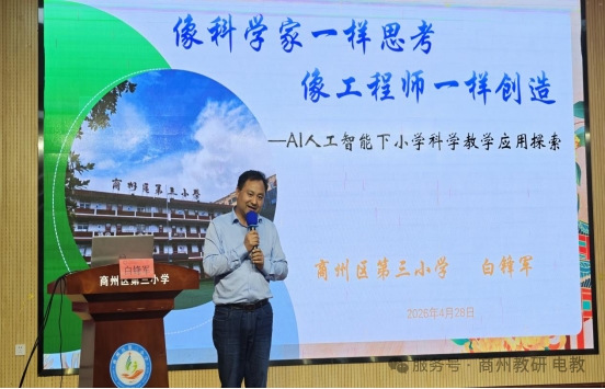 最后,商州区第三小学校长白锋军作《AI人工智能下小学科学教学应用探索》专题讲座。讲座结合一线教学实际,系统分享AI技术与科学学科融合的实操方法,针对性破解教学痛点,引发全体参会教师强烈教研共鸣,推动教学思维的深度碰撞。