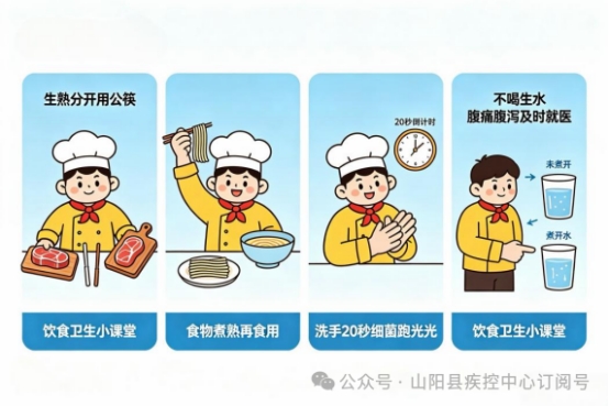 严把饮食卫生关,食材新鲜、生熟分开、食物煮熟;不喝生水、不吃生冷不洁食物;饭前便后规范洗手,外出就餐选择正规合格场所、使用公勺公筷;出现腹泻、呕吐及时就诊并做好隔离。