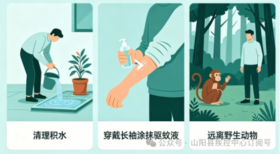 清理家中积水,定期更换水生植物水体,疏通沟渠杜绝蚊虫滋生;外出穿浅色长袖衣物、涂驱蚊剂,居室内安装纱门纱窗、使用蚊帐;不接触野生动物,出现不适及时就医,并主动告知户外暴露与野生动物接触史。