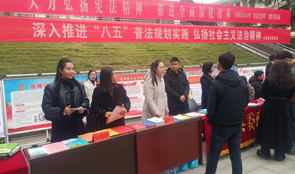 12月4日,在第十一个国家宪法日到来之际,由县委法治办牵头组织、包括县残联在内的45个县级普法成员单位共同参与,以“大力弘扬宪法精神 推进全面深化改革”为主题的山阳县2024年“12.4”国家宪法日暨“宪法宣传周”主题宣传活动,在县政府广场举行。